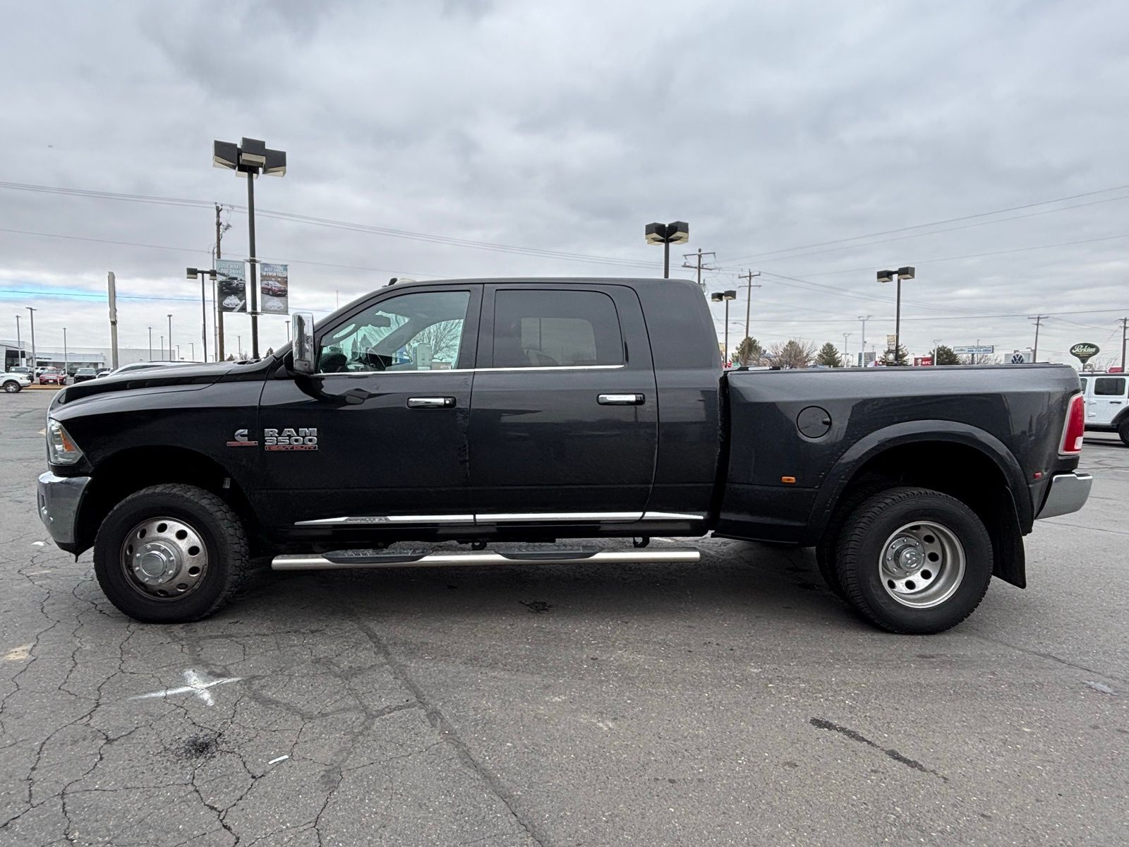 4WD 6-Speed Automatic 4D Mega Cab Cummins 6.7L I6 Turbodiesel CARFAX One-Owner. 115V Auxiliary Power Outlet, Auto High Beam Headlamp Control, Body Color Fender Flares, Bucket Seats, Chrome Belt Moldings, Chrome RAM Badge, Front Wheel Spats, Heated Second Row Seats, Heated Steering Wheel, High Back Seats, Instrument Cluster, Keyless Enter-N-Go, Laramie Limited Grille, Laramie Limited Leather Bucket Seats, Leather Wrapped Grab Handle, LED Bed Lighting, Limited Chrome Bodyside Molding, Limited Decor Group, Limited Tailgate Applique 4x4, Luxury Door Trim Panel, Luxury Front & Rear Floor Mats, Painted Front Bumper, Painted Rear Bumper, Power 10-Way Memory Driver & 6-Way Passenger Seats, Power Lumbar Adjust, Quick Order Package 2FM Limited, Rain Sensitive Windshield Wipers, RAM 3500 Badge, RamBox Cargo Management System, Rear 60/40 Split Folding Seat, Remote Proximity Keyless Entry, Steering Wheel Mounted Audio Controls, Vendor Painted Cargo Box Tracking, Ventilated Front Seats, Wheel to Wheel Side Steps, Wheels: 20" x 8.0" 6-Spoke Aluminum w/Inserts, Wood/Leather Wrapped Steering Wheel. 3500 Brilliant Black Crystal Pearlcoat 2016 2016 Ram 3500 Laramie Longhorn Laramie Longhorn Ram